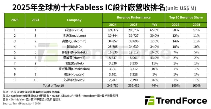 根據TrendForce最新調查,2025年各大雲端服務供應商(CSP)持續購買GPU、自研ASIC建置算力需求,帶動AI相關晶片設計業者成長,當年度全球前十大無晶圓IC(Fabless IC)設計公司合計營收逾3,594億美元,年增44%。NVIDIA蟬聯營收冠軍,Broadcom因受惠AI浪潮較深,排名上升至第二名,打敗消費性電子營收占比較高的Qualcomm。