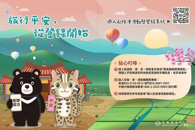 倘在港澳期間遇急難事件,可洽陸委會香港辦事處(駐地名稱為「台北經濟文化辦事處」;24小時緊急聯絡電話:852-6143-9012)或陸委會澳門辦事處(駐地名稱為「台北經濟文化辦事處」;24小時緊急聯絡電話:853-6687-2557)尋求協助。