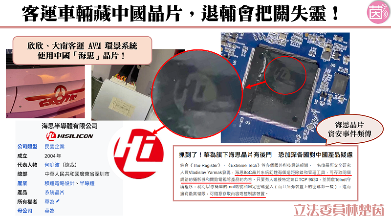 林楚茵在質詢時出示公車環景系統(AVM)拆解照片,指出晶片上的Logo雖遭刻意磨除,仍可清楚辨識為海思半導體產品。她強調,搭載中國晶片的電動公車等同移動式偵防設備,已構成國家安全重大隱患。林楚茵進一步指出,欣欣與大南客運最初回報系統產地為「台灣與荷蘭」,經她提供照片佐證並要求抽查後,退輔會才在8日更正,確認公車廠牌「創奕」所使用的「誠益」系統晶片產地確實為中國,且採購時間為2025年(民國114年),並非舊合約誤用。