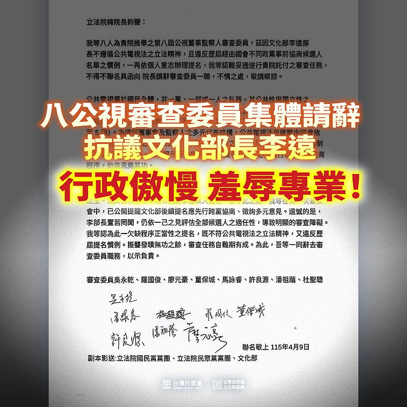 針對公視第8屆董監事人事卡關,8名國民黨、民眾黨推舉的審查委員今(9日)聯名發函立法院長韓國瑜,控文化部長李遠不遵循《公共電視法》立法精神, 一再依個人意志辦理提名,讓他們認為難妥適遂行立法院託付的審查任務,共同辭去審查委員職務。民眾黨團表示,委員們透過聲明表達他們對於李遠行政傲慢、羞辱專業的嚴正抗議,更象徵台灣公共媒體治理制度的一次大崩盤。
