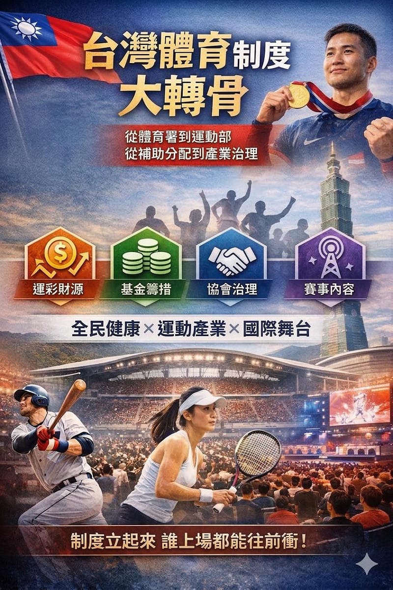 在治理結構上,政府正推動「體改2.0三支箭」,要求特定體育團體達成財務透明、業務公開、組織開放及營運專業。未來各協會獲取國家資源將與「運動員權益」深度掛鉤,包括運動員委員會具備實權、申訴管道外部化等四大條件,確保治理機制能獲得社會與企業的信任。