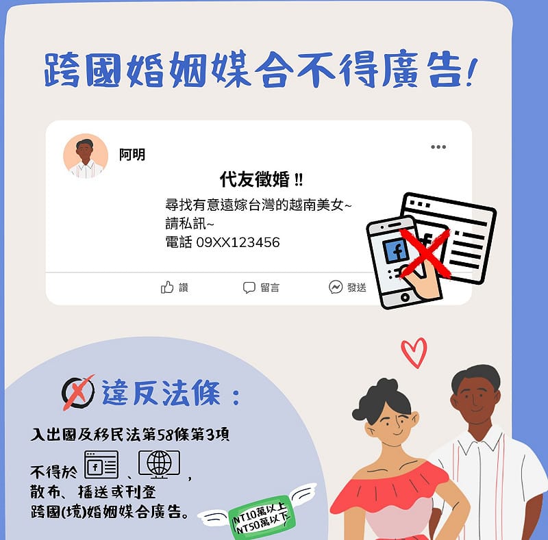 移民署表示,依據入出國及移民法規定,跨國(境)婚姻媒合不得廣告,違者將裁罰新台幣10萬元以上,50萬元以下的罰鍰。因此,移民署再次呼籲民眾及移工切勿以身試法,以免得不償失喔!