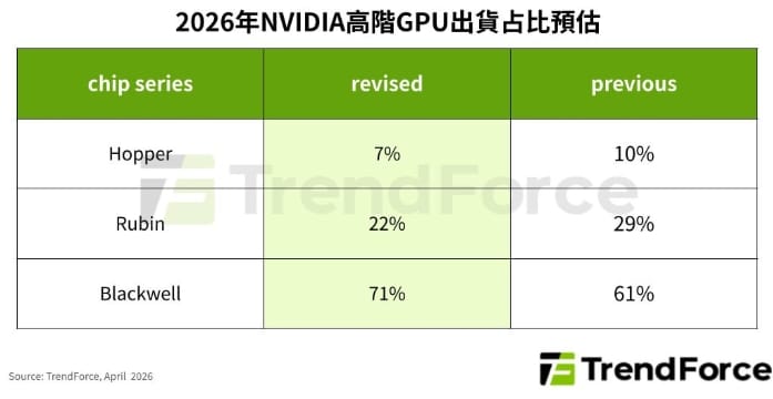 根據TrendForce最新AI server產業調查,2026年NVIDIA的高階AI晶片出貨結構將出現變化,受到地緣政治風險、供應鏈仍需時間調校等因素影響,預估Hopper、Rubin系列占其整體高階GPU出貨比例將下降,進而推升Blackwell系列占比從61%大幅成長至71%,主導市場的地位更加鞏固。