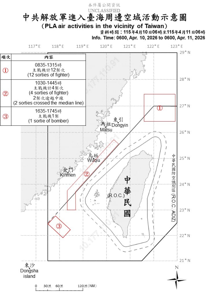 在國民黨主席鄭麗文赴中與中國國家主席習近平舉行「鄭習會」之際,中國解放軍對台軍事壓力同步升高!國防部今(11)日公布,自昨日清晨6時至今日清晨6時止,偵獲共機17架次,其中多達15架次逾越台海中線,進入北部及西南空域;另有共艦7艘及公務船1艘持續在台海周邊活動。