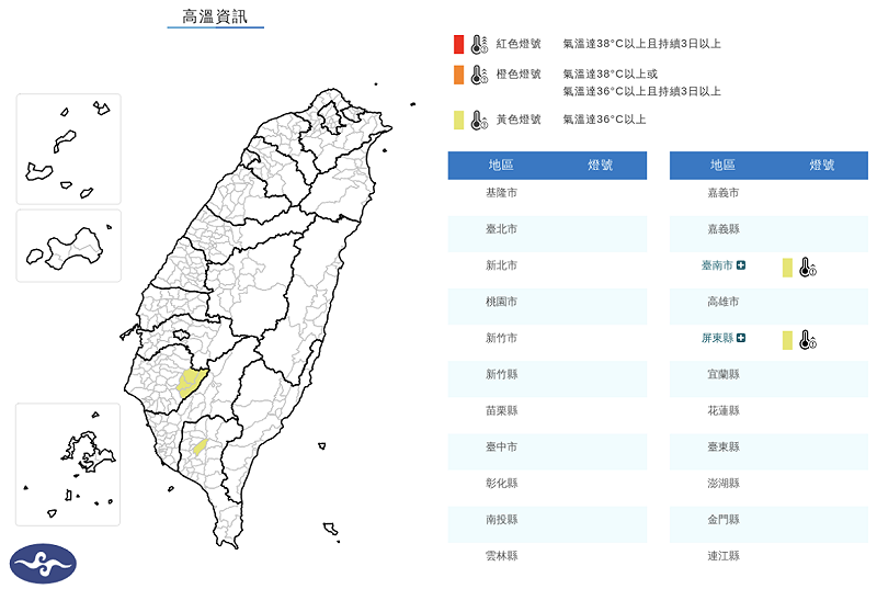在離島及環境資訊方面,澎湖晴到多雲,25至28度;金門多雲,21至26度;馬祖陰時多雲,18至23度。;金門與馬祖則受低雲或霧影響,能見度較低且影響時間較長,交通往返需多留意路況與航班資訊。此外,受西南風增強影響,桃竹苗、彰化沿海及馬祖、綠島需注意6至8級以上的強陣風。空氣品質部分,全台擴散條件普通,各地空品等級多為「普通」,但午後受光化作用影響,臭氧濃度可能稍易上升。