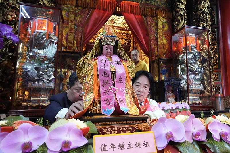 白沙屯媽祖12日深夜啟程前往北港朝天宮進香,總統賴清德下午先後前往苗栗縣山邊媽祖宮與白沙屯拱天宮參香、恭送媽祖起駕,並在致詞時代表全國人民祈福,盼今年進香活動平安順利,也祈求媽祖庇佑台灣風調雨順、國泰民安。