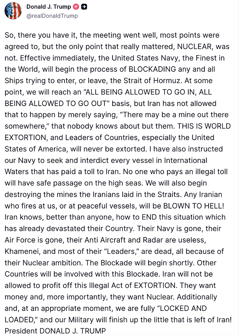 美國中央司令部周日表示,軍方將於美國東部時間 13 日上午 10 點封鎖所有進出伊朗港口的船隻。並補充,美國不阻礙往返非伊朗港口的船隻。中央司令部在一份聲明中表示:「封鎖將對所有進出伊朗港口和沿海地區的國家的船隻一視同仁執行,包括伊朗在阿拉伯灣和阿曼灣的所有港口。」