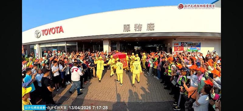 根據TOYOTA苑裡營業所表示,今年已是媽祖第11次停駕,被信眾稱為「媽祖最愛的車廠」、「超級VIP」。今天進香首日,大批香燈腳湧入苑裡鎮,現場人山人海,相當壯觀。今年白沙屯媽祖進香報名人數再創新高,達46萬3588人,較往年明顯成長,預估實際隨行人數恐達百萬規模,廟方指出,「粉紅超跑」預計於16日(四)抵達雲林北港,17日舉行進火儀式,20日(一)回鑾,5月1日開爐。