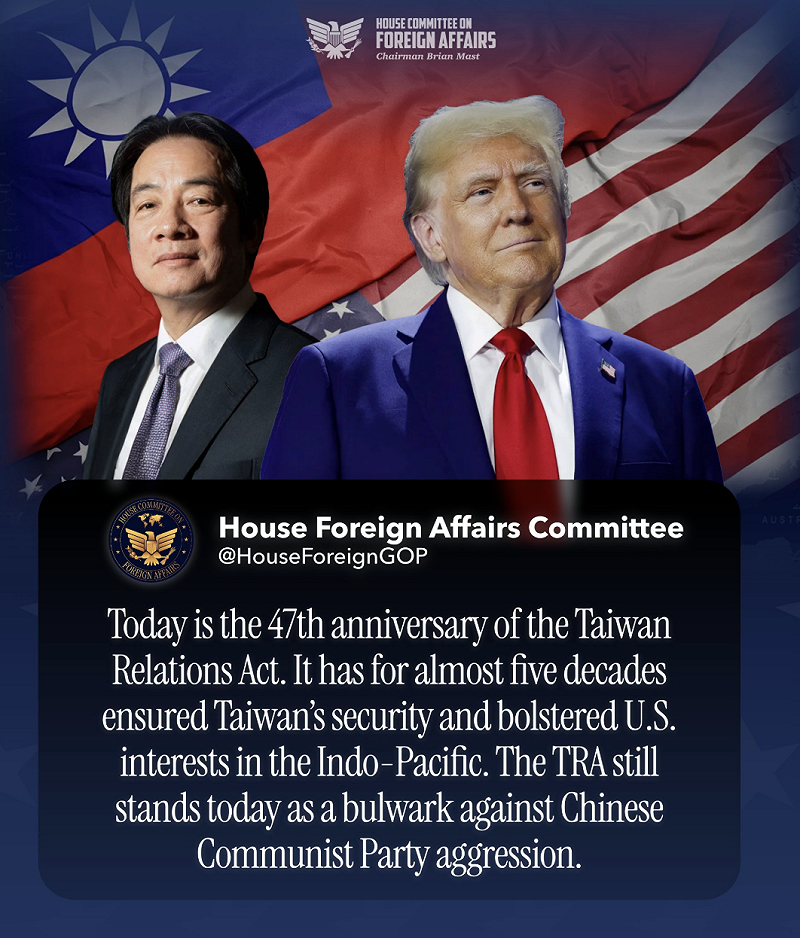 美國聯邦眾議院外交委員會共和黨團日前在社群平台X發文紀念《台灣關係法》立法47周年,強調該法長期以來不僅確保台灣安全,更是抵禦中國共產黨侵略的堅實堡壘。值得關注的是,發文附上的圖是川普與賴清德的照片,以及美國與台灣的國旗。