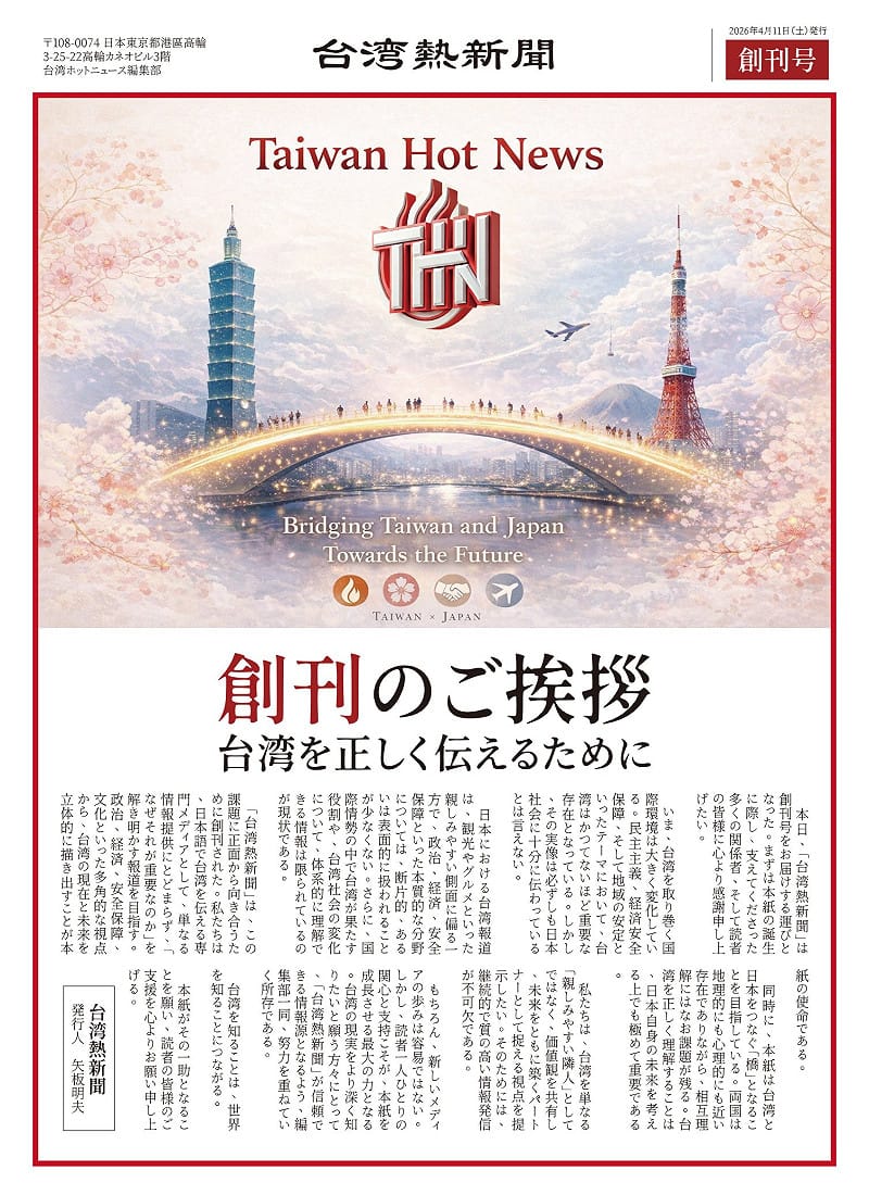 矢板明夫在「創刊致詞」中表示,「台灣熱新聞」以成為連結台灣與日本的「橋樑」為目標。儘管兩國在地理與情感上相當接近,但相互理解仍存在課題。在國際局勢快速變動的當下,正確認識台灣不僅攸關區域發展,也對思考日本未來具有重要意義。在民主、經濟安全與區域穩定等議題上,台灣的重要性正不斷提升。