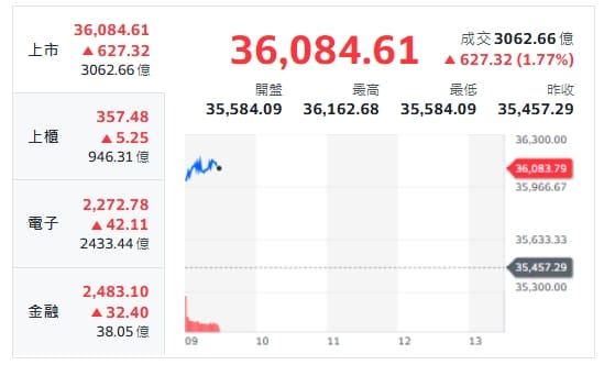 台股今天(14日)開紅走高,漲逾627點,最高來到36162點,站上36000點。上櫃與電子、金融全揚升。重要電子權值股F4,約9點半,台積電衝漲30元、來到2020元。廣達漲8.5元、來到327.5元。鴻海漲6.5元、來到206.5元。聯發科漲60元、來到1680元。台達電漲40元、來到1780元。