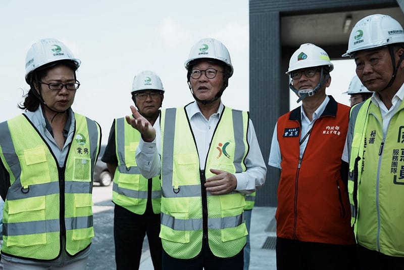 行政院政務委員、公共工程委員會主任委員陳金德14日率隊前往台南市學甲區,視察「M幹線抽水站及調節池工程」。 圖:行政院提供