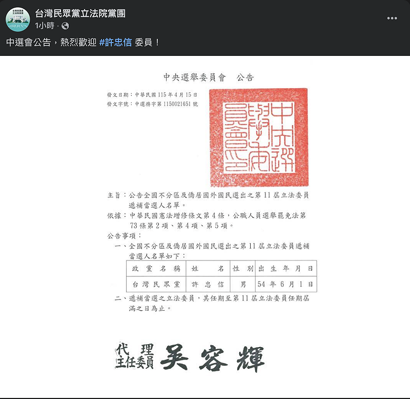 中選會今公告遞補當選人名單,依據憲法增修條文第 4 條、公職人員選舉罷免法第 73 條第 2 項、第 4 項、第 5 項,公告民眾黨許忠信遞補當選名單,任期至第 11 屆立委任期屆滿日為止。