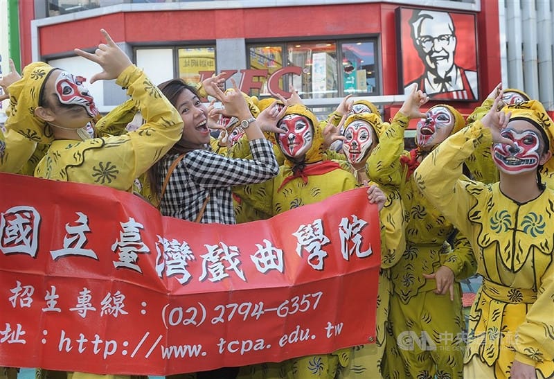 圖為國立台灣戲曲學院京劇學系學生過去在西門町 進行戲曲藝術上街京劇西門町快閃活動,學生們扮 演孫悟空,與一名觀光客合影。(中央社檔案照片) 圖:中央社提供