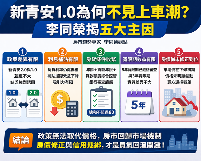 李同榮指出,新青安1.0將屆滿三年,但市場未出現上車潮並非偶然,而是五大結構性因素共同作用的結果: