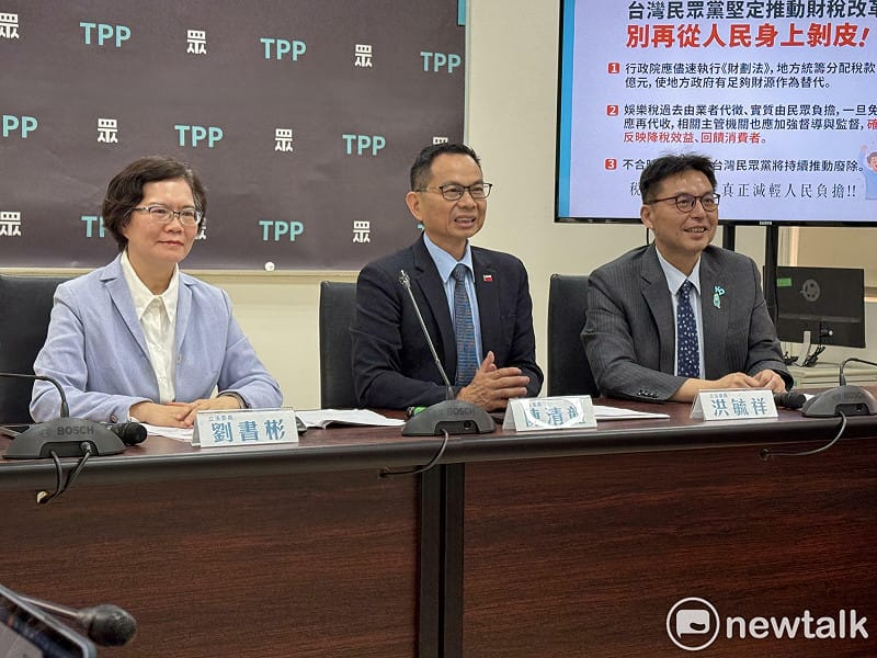 民眾黨團上午召開「大砍娛樂稅 真正減輕人民負擔」記者會,陳清龍、洪毓祥、立委劉書彬及黨團主任陳智菡等人出席。