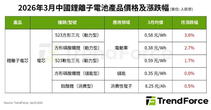 根據TrendForce最新鋰電池產業研究,2026年第一季電池原料價格強勢上漲,支撐動力電池價格上行至三月份,電芯均價出現1-3%不等的月漲幅。其中,軟包三元已上漲至0.59人民幣/Wh,方形三元、磷酸鐵鋰則為0.58人民幣/Wh和0.38人民幣/Wh。