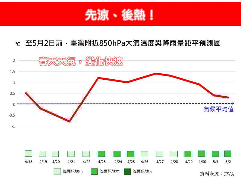 不過,這波涼意不會持續太久,預估自4月23日後氣溫逐步回升,並轉為高於氣候平均值,到了4月26日至28日更將達到本波高溫高峰,天氣明顯轉熱,呈現「春天秒切夏天」的型態。
