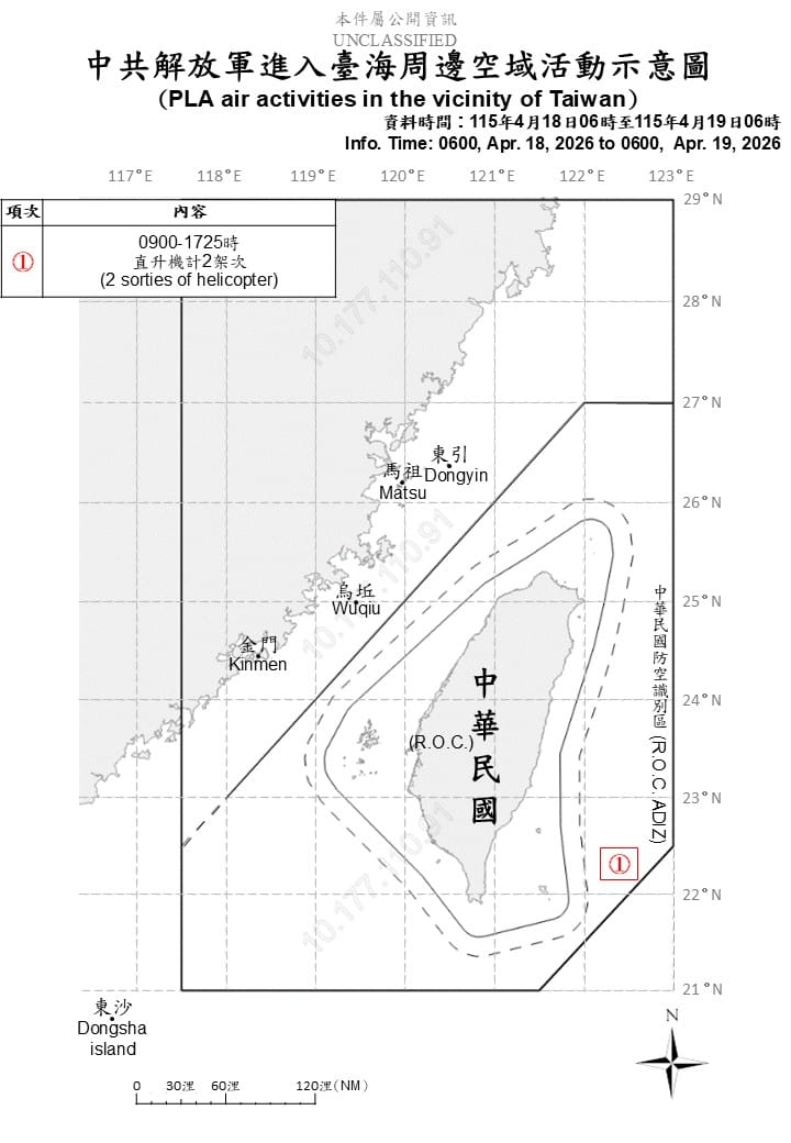 國防部今(19)日發布最新台海周邊動態指出,自4月18日06時至19日06時止,偵獲共機2架次進入東部空域活動,同時還有共艦6艘及公務船1艘在台海周邊持續侵擾,海空聯動態勢未歇。