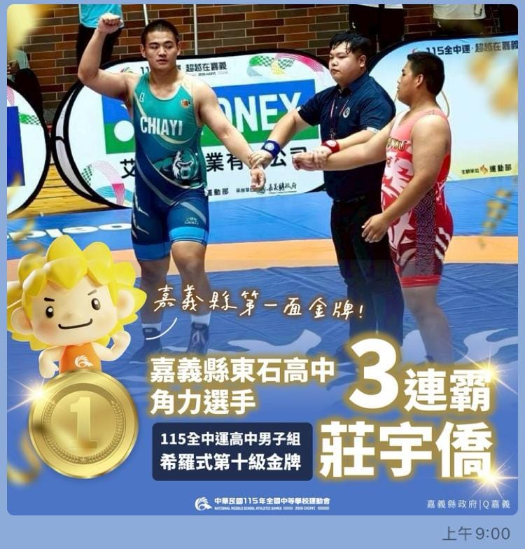 115 年全國中等學校運動會於嘉義登場,地主嘉義縣代表隊首日即傳捷報。東石高中選手莊宇僑在高中男子組希羅式第十級賽事中奪金,完成三連霸,為嘉義縣拿下本屆首面金牌。