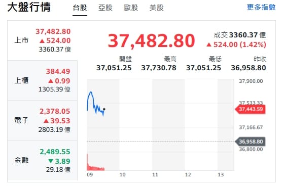 台股今天(21日)開紅漲逾500點,最高來到37730點,上櫃、電子全揚升,金融紅翻黑。重要電子權值F4,約9點20分前,台積電漲逾30元、來到2055元。鴻海漲2.5元、來到210元。台達電漲55元、來到1955元。廣達漲9元、來到338元。聯發科漲105元、來到2005元。