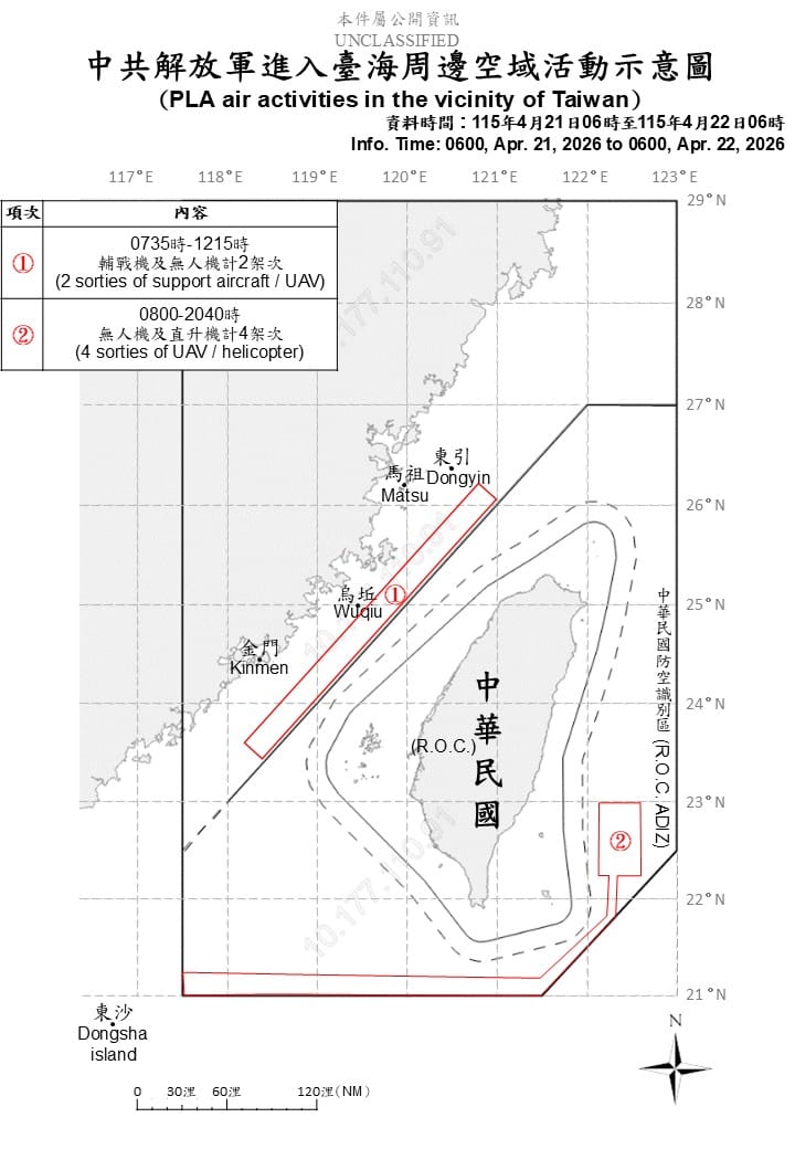 國防部表示,自21日上午6時至22日上午6時止,共偵獲解放軍軍機6架次出海活動,其中4架次進入台灣西南及東部防空識別區(ADIZ);另有共艦5艘及公務船1艘在台海周邊持續活動。