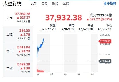 台股今天(22日)開紅走高逾327點,最高來到37969點,逼近38000點!上櫃電子與金融類股全揚升!重要電子權值股F4,約9點半前,台積電漲20元、來到2070元。廣達跌0.5元、來到339.5元。聯發科漲100元、來到2190元。台達電跌10元、來到2005元。鴻海漲9.5元、來到220.5元。