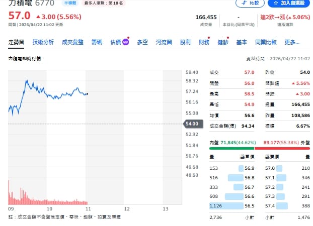 力積電(6770)因出售銅鑼P5廠給美光,帶動一次性處分利益入帳,推升今年第一季獲利大幅成長,成功終結連續十季虧損。受利多激勵,今(22)日股價盤中一度大漲超過8%,最高觸及58.5元,隨後漲幅收斂,成交量亦可觀。