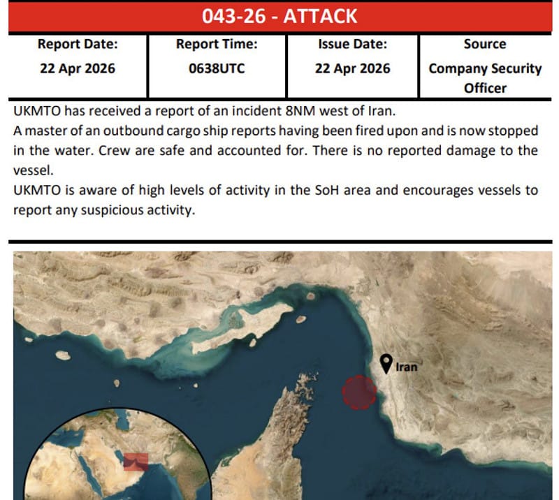 根據 X 平台 @OSINTtechnical 發布的消息指出,一艘商業用的貨櫃船於今(22)日凌晨行徑阿曼東北方約 15 海浬處遭到伊朗船隻襲擊,導致荷姆茲海峽局勢再度陷入緊張。據 X 平台 @xinwendiaocha 引述英國海上貿易行動辦公室的消息稱,一艘隸屬於伊朗伊斯蘭革命衛隊的武裝炮艇在未進行任何無線電預警的情況下突然接近該商船,並直接對其開火。