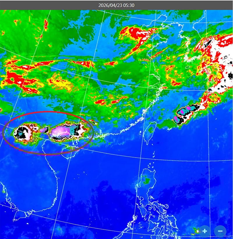 前中央氣象局長鄭明典,今(23)日在臉書上PO出衛星雲圖。圖中南海一帶圈起來的地方持續有強對流發展,雲頂出現紫色區塊,通常代表雲頂高度極高、對流極強的區域。鄭明典解釋,雲幾乎是由一個定點出現,然後往東飄,飄沒很遠就消散;但相較於雲是在飄動,但是整個雲團的位置幾乎不動,這是雲和看雲團的差異。