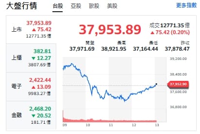 台股今天(23日)走勢明顯呈現「先強後壓」格局,早盤一度延續多頭氣勢再創高點,但隨著賣壓快速浮現,指數震盪加劇,高檔出現明顯分歧。截至今天(23日)1點前,大盤由漲逾千點,翻黑跌逾500點後,收斂跌幅之後小漲75點,再度逼近38000點。成交量突破1兆元。