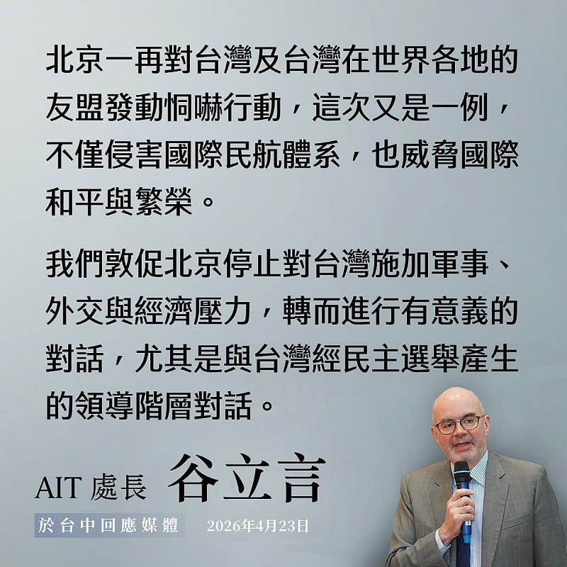 總統賴清德原訂出訪我非洲邦交國史瓦帝尼,但總統府表示,因為中國施壓導致有非洲3國取消專機飛航許可,因此暫緩總統出訪。對此,美國在台協會(AIT)處長谷立言今(23)日表示,北京一再對台灣發動恫嚇行動,美方敦促北京停止施壓台灣,轉而與台灣經民主選舉產生的領導階層對話。