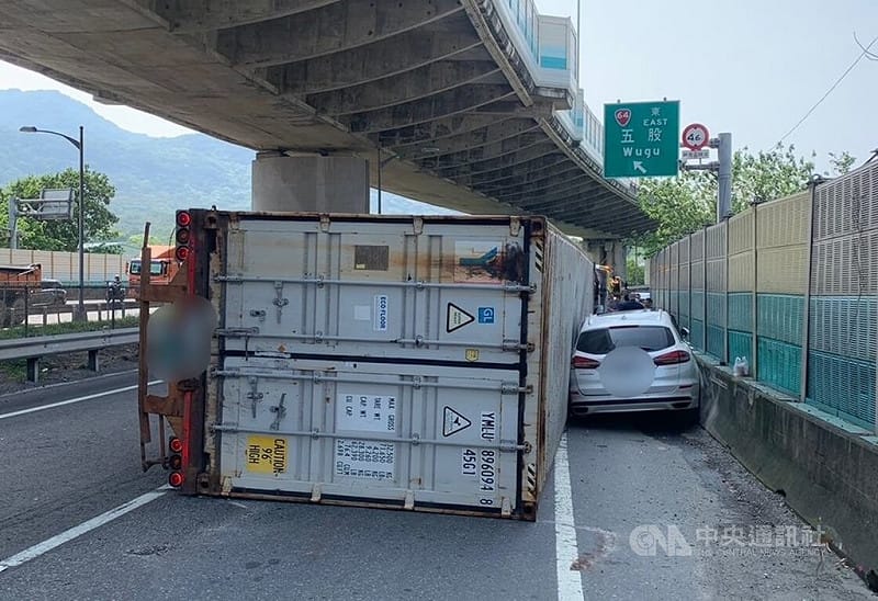 蘆洲分局以訊息說明,案發地點在台64線八里區往五股方向上匝道口附近,37歲羅姓男子上午8時45分駕駛貨櫃車沿中華路左轉欲往台64線匝道處,因不明原因翻覆。