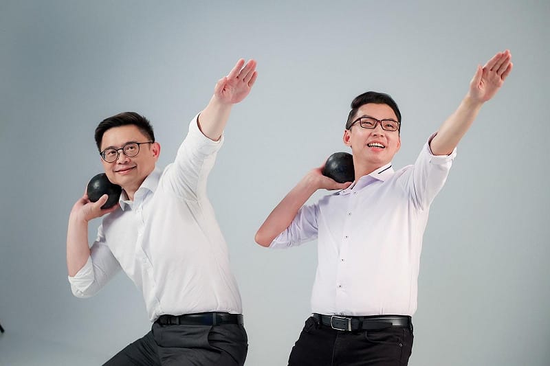 曾是壘球國手的蘇致榮(右)和賴瑞隆(左)展現健康的運動男形象。 圖:賴瑞隆服務處/提供