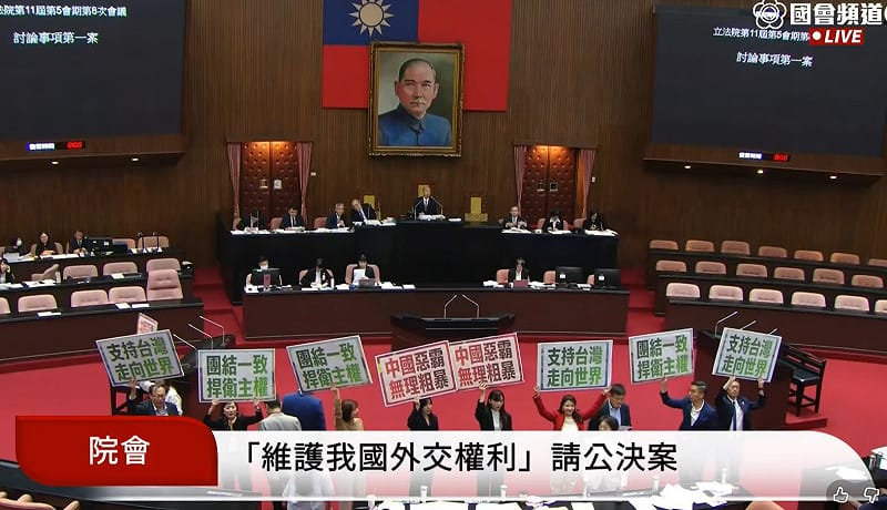 民進黨團提出「維護我國外交決議」公決案,要求立法院堅定支持我國總統進行對外國是訪問,嚴正譴責中共對第三國主權之公然干涉案。