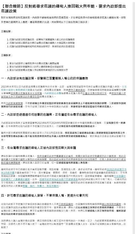 另外,該聲明也提出三個訴求:1.要求內政部停止催逼救濟中的尋求庇護人離開台灣。2.要求內政部針對國際法上的禁止遣返對象提出居留政策。3.要求內政部對尋求庇護人作成暫時性資格認定以保障其生存