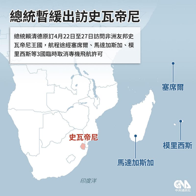 賴總統原訂22日啟程前往非洲友邦史瓦帝尼,但因塞席爾、模里西斯、馬達加斯加取消專機飛航許可,行程暫緩。總統府秘書長潘孟安說,實際原因是中國當局以經濟脅迫等手段強力施壓。
