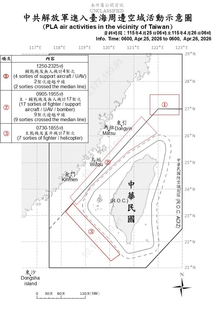 國防部今(26)日上午公布最新台海周邊海、空域動態,統計自昨日上午6時至今日上午6時止,國軍共偵獲共機28架次、共艦8艘,持續在台海周邊活動。
