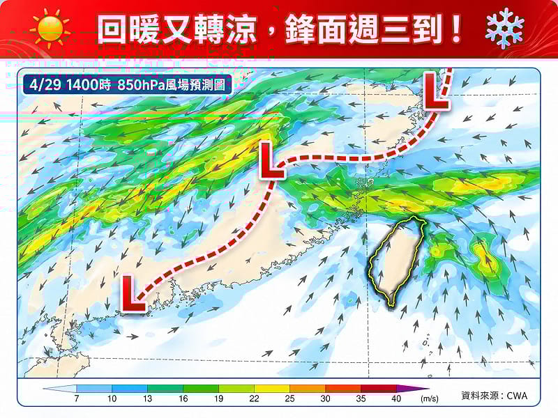 29日受鋒面逐漸通過影響,天氣轉為不穩定,降雨機率增高;30日東北季風增強及華南雲雨區東移,各地天氣轉涼,水氣減少,降雨逐漸趨緩;5月1日東北季風逐漸減弱,各地氣溫再度開始回升;5月2日環境風場轉為偏南風,回暖顯著,東半部28至30度,西半部30至33度。