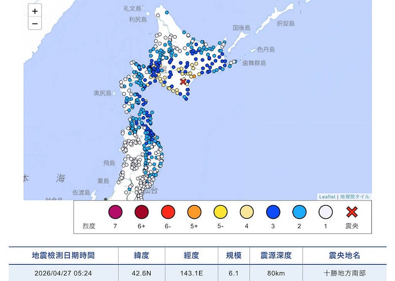 日本北海道27日清晨發生規模6.1地震。(圖取自日本氣象廳data.jma.go.jp)