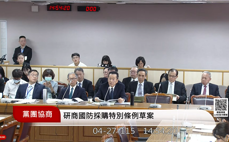 立法院長韓國瑜今(27)日再度針對「軍購特別條例」召開第三度朝野協商,會議進行30分鐘仍沒有進度,國民黨、民眾黨會中持續針對「美國是否有第二份發價書」、「軍售項目有哪些」等問題,但遭到國防部長顧立雄直接回嗆,有來機密會議聽過應該知道。