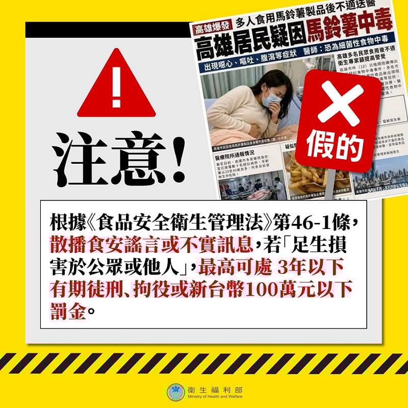 衛福部提醒,看到這類貼文千萬別手滑轉傳。 依《食品安全衛生管理法》第46-1條規定,散播足以損害他人或大眾利益的食安不實訊息,最重可判3年以下有期徒刑,或科罰金新台幣100萬元以下。 衛生局呼籲民眾,收到未經證實的食安消息,務必先查證來源,不輕信、也不轉傳。