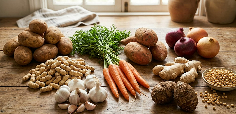 農業部提醒,發芽馬鈴薯含龍葵鹼須整粒丟棄,花生若發霉也別吃,其餘多數發芽食材仍可食用。 圖:chatGPT_AI 生成 / 曾郡秋製表