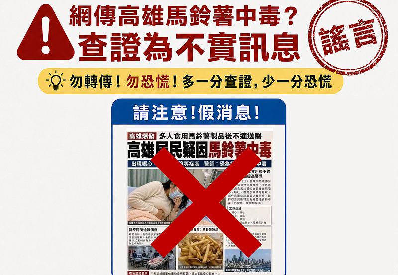 針對有民眾近日於臉書社群發文製圖,指高雄市4月18日疑有馬鈴薯食品中毒案件,並有民眾症狀嚴重就醫,高雄市政府衛生局今(27)日嚴正澄清,強調經查4月18日起迄今並未接獲任何醫療院所及1999通報有疑似馬鈴薯食品中毒案件,此則社群發文為不實訊息,將依法究辦。