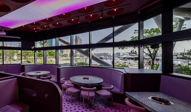 Meat cute的空間設計透過前衛的色彩實驗與異材質語彙,將抽象的音樂節奏具象化為沉浸式的餐飲場域,現場更有DJ電音播放與節奏型燈光設計。天花板佈置巨大的圓孔燈陣,即是象徵音響單體般的律動結構;落地玻璃則將觸目即及的高雄港灣景引入,室內迷幻光影與室外港灣景深交織邂逅。空間內流動感十足的迷幻數位藝術牆,隨著不同時段的樂風切換,將燒肉的炙熱工藝揉入港灣節奏,於感官巔峰之處,開啟一場關於美學的潮汐實驗。