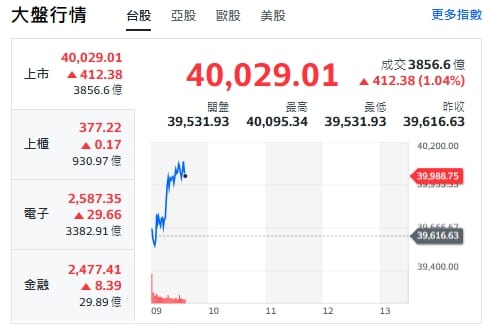 台股今天(28日開紅續衝逾400點,約9點30分前最高來到40095點。上櫃、電子與金融類股全揚升。重要電子權值股F4,台積電漲10元、2275元。鴻海漲4元、來到232元。台達電漲110元、來到2130元。廣達跌5.5元、來到320元。聯發科漲215元、來到2650元。