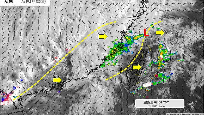 吳聖宇表示,29日隨著中高層短波槽向長江下游東移,台灣北部海面至東海一帶低壓波動逐漸發展加深,帶動地面鋒面南下,受到鋒前西南風影響,中北部、東北部地區從上午起就會逐漸轉趨不穩定,雲量增多,逐漸有局部短暫陣雨出現,下午到晚間鋒面逐漸通過台灣上空,配合局部熱對流發展,中北部、東北部持續會有短暫陣雨或雷雨,並有局部較大雨勢發生機會,南部、花東地區亦將開始有短暫陣雨,不過降雨量相對較少。