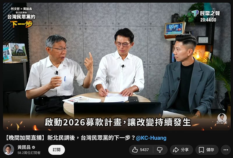 黃國昌昨晚跟柯文哲合體開直播,公布2026年的募款計畫,柯文哲比出食指說,募款目標1000萬,黃國昌還說,「這次不是賣老臉,是賣我這張帥臉,阿北(柯文哲)賣和藹可親的臉,拜託大家」。