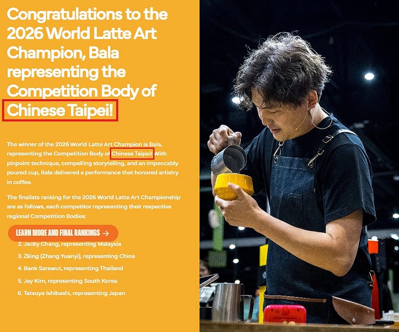 「2026世界盃拉花大賽」日前於美國登場,台灣選手林紹興(Bala)勇奪冠軍,現場與頒獎典禮皆清楚標示「Taiwan」,並手持國旗合影,展現「Team Taiwan」榮耀。不過,賽後主辦單位官網卻將「Taiwan」更改為「Chinese Taipei」,引發爭議。對此,民進黨立委林楚茵今(29)日發文痛批,中國打壓無所不在,「連國際咖啡比賽也不放過」。