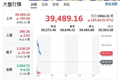 台股今天(30日)開紅漲逾185點,最高來到39848點。上櫃、電子揚升。金融類股下挫!約9點20分前,重要電子權值股,台積電漲10元、來到2190元。鴻海漲1元、來到226元。廣達跌2.5元、來到319.5元。聯發科平盤、維持2575元。台達電漲45元、來到2210元。
